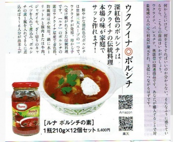 「とくし丸」雑誌 2025年4月-5月号にて、 弊社が輸入・販売しておりますウクライナ産ボルシチ(瓶詰)が紹介されました。 「お取り寄せで支援!」の特集記事内で、 弊社商品を通じたウクライナ支援の取り組みをご紹介いただきました。 温かいご支援をいただき、誠にありがとうございました。